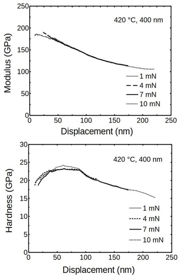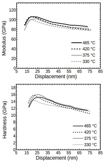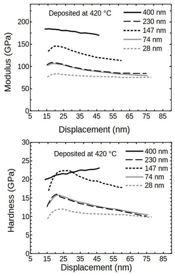 Figure 8 visualizes the relation between the modulus and the deposited thin film thickness (deposited at 420 °C). It indicates that the softer substrate has a reducing impact on the results, which diminished inversely with film thickness. The hardness showed similar trends as the moduli (Figure 8).