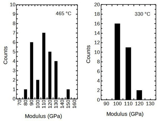 The scattering of the nanoindentation results taken at 20 nm of displacement are presented in the histograms (Figure 7). It can be seen that the X-ray amorphous thin film deposited at 330 °C had lower scattering (±10 GPa) than the crystalline counterpart (±35 GPa) deposited at 465 °C. As an overall notice, the scatter widened with the growth temperature Tg.