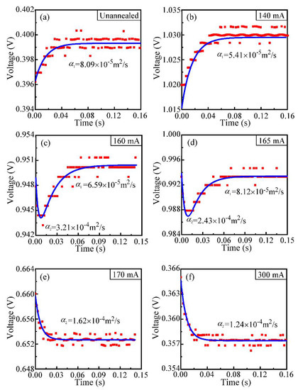 | Sample | Ia ×10−3 A | Low-Level Thermal Diffusivity after Annealing | High-Level Thermal Diffusivity after Annealing | Low-Level Thermal Diffusivity before Annealing | High-Level Thermal Diffusivity before Annealing |