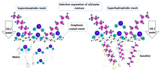 Synthesizing underwater superoleophobic filtration materials with excellent anti-oil-fouling performance and robust stability in harsh environments is required for high efficiency oil/water separation processes. Graphene-coated meshes are a very promising candidate for oil/water separation processes, with its oleophobicity, hydrophobicity, and simple separation mechanism (Figure 5). Chen et al. [143] adopted irregular hydrophilic graphene oxide (GO) as a coating material to modify an oxidized copper mesh with the desired hydrophilic composition and hierarchical surface roughness using a novel in situ copper ion induced crosslinking approach. The as-prepared GO@CuO mesh by the authors was efficiently applied in the separation of oil/water mixtures, with an efficiency greater than 99.49% and good reusability. As a result of the high oil–water separation efficiency, excellent anti-oil-fouling property, and good stability, the prepared underwater superoleophobic mesh in this study is an ideal effective candidate for broad applications in oil/water separations [143]. Lu et al. [44] reported a mild, environmentally friendly, and cost-effective method to synthesize graphene oxide (GO) and reduced graphene oxide (RGO) coated meshes with superoleophobicity and superhydrophilicity/underwater. The GO-coated meshes showed a high unidirectional separation efficiency for water mixtures with various light oils, while the RGO-coated meshes exhibited an outstanding capability of separating several types of heavy oils from water. The results of this study show that both types of meshes could attain their original wettability in harsh environments, and demonstrate high recyclability and efficiency for the separation of oil/water mixtures containing boiling water, salt, and acid. [44]. Yin et al. [144] successfully fabricated an environmentally friendly stainless steel mesh (SSM) decorated with graphene oxide (GO) and polydopamine (PDA) for oil/water mixture separation using a facile dipping coating method. The as-prepared SSM/PDA/GO mesh in this study was capable of separating oil/water mixtures with an ultra-high flux reaching 15,000 L × m−2 × h−1 and an outstanding separation efficiency, which is greater than 99.95%. Moreover, SSM/PDA/GO possesses an outstanding stability under harsh environmental conditions, indicating that the mesh is a promising candidate material for practical oil spill remediation in harsh conditions, specifically in a highly salty marine environment [144].