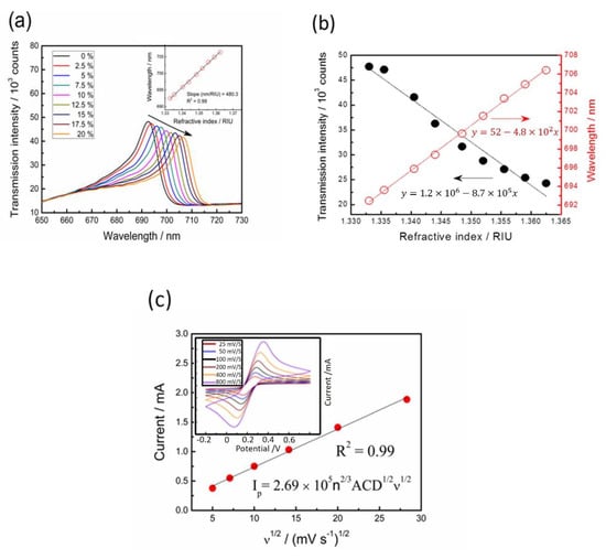 Characterization of the optical properties and electrochemical behaviors on EC-SPR sensors: (a) transmission spectra of capped gold nanoslit arrays in glycerol–water solutions with different environmental refractive indices; (b) the intensity and wavelength changes as a function of refractive index; (c) the relationship between the square root of scan rate and peak current from cyclic voltammograms.