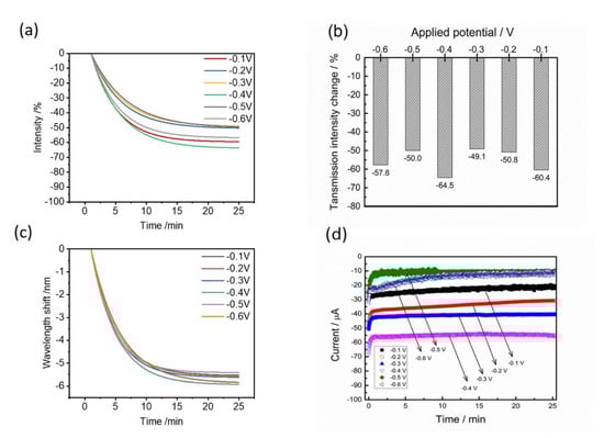 From a practical aspect, the chronoamperometry method with a constant applied potential is more achievable than the cyclic voltammetry method. The CV method usually needs an accurate and high resolution of the equipment, but the chronoamperometry method has a much lower cost and is easily set up by a DC voltage. Moreover, the detection sensitivity of the EC-SPR method for Hg2+ detection is determined by the applied potential and deposition times. Hence, the optical performances of transmission changes and wavelength shifts were characterized under various applied potentials from −0.1 V to −0.6 V (Figure 5). According to the results, the decreases of the transmission intensities at 20 min are −60.4, −50.8, −49.1, −64.5, −50.0 and −57.8% for various applied potentials of −0.1, −0.2, −0.3, −0.4, −0.5 and −0.6 V (Figure 5a). The resulting wavelength shifts rapidly reach the equivalent values within 20 min but −0.4 V owns the largest wavelength shift and is distinguishable in the potential ranges (Figure 5b). Figure 5c shows the SPR signal changes at 25 min reaction time for various applied voltages. It can be seen that −0.4 V has a more appropriate applied potential for further studies due to the highest change of the intensity change of −64.5% and wavelength shift (−6 nm). According to the influence of the applied potential, the electrochemical currents were simultaneously obtained at various applied potentials (Figure 5d). The highest reduction current (−58 μA) from Hg2+ electrodeposition also occurred at about −0.4 V.