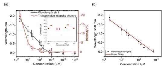 where I0 is the referenced intensity. In the measurement, the transmission intensity in water (n = 1.3333) was set as I0. The wavelength sensitivity of the capped gold nanoslit arrays (the linear regression slope for the refractive index) was calculated from the resonance wavelength change (Equation (1)) and was estimated as 480.3 nm RIU−1. Furthermore, the intensity sensitivity of 1819.9% at 693.2 nm is obtained from the relative intensity change over the refractive index change at a fixed wavelength near resonance (Equation (2)). The figure of merit (FOM) defined as the quotient of wavelength sensitivity and full width at half maximum is an important parameter for the quality evaluation of a sensor. In this study, the corresponding FOM value was calculated from the resonance peaks as 40.0 RIU−1.