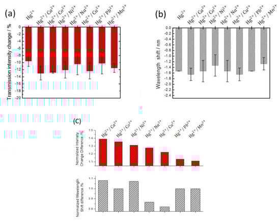 The selectivity of EC-SPR sensors by investigating (a) the transmission intensity changes and (b) the wavelength shifts for 10 μM Hg2+ in the presence of 10 μM interfering ions in 10 mM KCl solution, including Ca2+, Co2+, Ni2+, Na+, Cu2+, Pb2+ and Mn2+. (c) The variations of the normalized transmission intensity changes and the wavelength shifts of mixing ions compared to Hg2+ at 20 min reaction time. The error bars represent the standard deviation from three repeated tests.