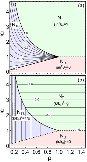 Phase diagrams in the space of the dimensionless parameters and showing the boundaries of states with constant projection of the uniaxial nematic director n along the modulation direction Z. For NU the projection is maximal, ; for NT it is minimal, and intermediate for the NTB, . The values of and of the scaled wavenumber are indicated on the constant-value contours of (a,b) respectively.