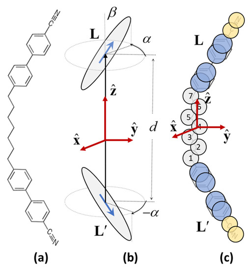 (a) Molecular structure of the CB-7-CB molecule in the all-trans conformation. (b) Molecular model used in the molecular theory of Section 3. The model mimics minimally the architecture of the mesogenic dimer in (a), particularly the bent-core structure and statistical a-chirality (equal weight for α and –α angles). (c) Spherical united atom representation of the mesogenic dimer in (a) as used in the molecular dynamics simulations of Section 4. The model is endowed with the full flexibility of the spacer chain, with conformations generated according to the Ryckaert–Bellemans torsional potential and segmental interactions parameterized as in [40]. The rigid segments L and L’ in (b,c) denote the mesogenic units of the dimer molecule.