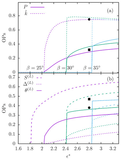 The temperature dependences of the polar order parameter P and of the modulation wave vector k (in units of 1/d) are shown in Figure 5a for different values of the bend angle β. It is apparent that the transition temperature and the phase sequence leading to the NTP (either directly from the isotropic or via NU) are sensitive to the angle β; above a critical value of β, the NU is eliminated from the stable-phase sequence and the transition takes place directly from the isotropic fluid. Similarly, the polar order parameter P is sensitive to the angle β, as expected from the sensitivity of the molecular-shape-polarity to variations of that angle. The temperature dependence of P shows a gradual or abrupt increase at the onset of the modulated phase, depending on whether the transition is from the NU or directly from the isotropic fluid. Notably, k shows marginal dependence on the angle β as well as on the reduced temperature, aside from a rapid or abrupt (in the case of direct transition from the isotropic) rise at the onset of the modulated phase. This is in accord with the notion that the modulation is generated by the molecular packing and therefore k is essentially determined by the molecular geometry. The situation here is in marked contrast with the elastic modulation wave number , which is determined by the twist and bend elastic constants (see Section 2.3.1).