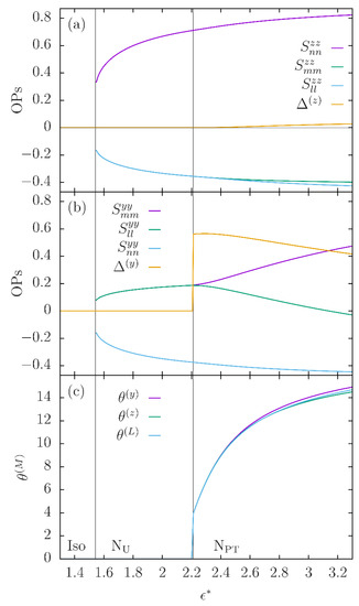 Obviously, the angle is not to be confused with the angle of the twist–bend state, nor should the principal axis be confused with the nematic director n under the respective twist and bend deformation. Whilst is identical for all molecular segments in the NTB state, each molecular segment M has its own principal axis frame in the NPT phase (with the C2 symmetry axis m being common to all such frames) and therefore the angle is different for different molecular segments. This has direct bearing on observables obtained by NMR measurements in the NX phase [38,39]. In Figure 6, the temperature dependence of the angles and the respective major principal values are plotted for two molecular axes (see Figure 4b), i.e., for M = , together with the difference between the two minor principal values of the second rank ordering tensors for these molecular axes. A clear segment-dependence of both the degree of ordering and of the biaxiality is apparent from the plots in Figure 6a,b and also from Figure 5b for the mesogenic units (i.e., M = L).