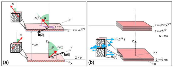 where is the unit vector along the modulation direction (Z axis), is the polar director (local C2 axis of the phase), is the molecular C2 axis and is the molecular axis along the line connecting the centers of the two mesogenic units of the molecule (Figure 4b). Note that the scale of the modulation wave number k is set by the intramolecular distance d.
