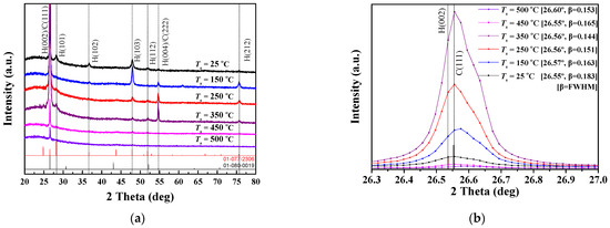 (a) XRD results of CdS thin films fabricated at various substrate temperatures, and (b) the details of the H(002)/C(111) peaks corresponding to the main diffraction plane in the XRD patterns.