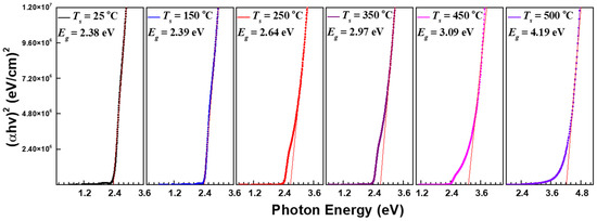 Figure 3 shows the optical transmittance results for CdS thin films fabricated over a wide substrate temperature range. The sharp absorption edge of the CdS thin film deposited at 350 °C was observed near the wavelength of 500 nm. However, at higher temperatures between 450 °C and 500 °C, the absorption edge wavelengths were confirmed at 300 nm and 270 nm, respectively. The average transmittance of the room-temperature-sputtered CdS thin film measured for wavelengths between 500 to 1100 nm was 66%. The transmittance values for the CdS thin film improved to 76.3% at 150 °C, 82.8% at 250 °C, 81.5% at 350 °C, and 91.2% at 450 °C with the increase in the substrate temperature. At a substrate temperature of 500 °C, the transmittance decreased to 88.8% compared to the immediately preceding condition. The absorption edge of the transmittance spectra at substrate temperatures of 450 °C and 500 °C shifted to the shorter wavelength region. The blue shift of the absorption edge is thought to be related to the shape of the crystal’s growth. We previously mentioned the singularity of the shape variation of the surface and cross-section of CdS films grown at 450 °C and 500 °C through the SEM results in Figure 2. In the deposited films under these conditions, the spacing between adjacent crystal grains is unusually wide. It also indicates that the crystal growth was randomly grown in an irregular direction rather than perpendicular to the substrate. Due to these results, it is thought that the transmittance pattern of the deposited CdS film in this temperature range exhibits an amorphous-like behavior. Moreover, the interference fringes of light observed in the 500 to 1100 nm wavelength range were absent. This may be due to the volatilization of the Cd element, which occurs when exposed to temperatures above 450 °C, as indicated in Table 2.