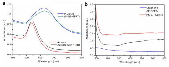 UV-Vis Absorption Spectroscopy: (a) absorption spectroscopy of gold core, gold core modified Raman molecule, P-GERTs, and (MS) P-GERTs; (b) UV-Vis absorption spectroscopy of graphene, GP-GERTs and MS-GP-GERTs.