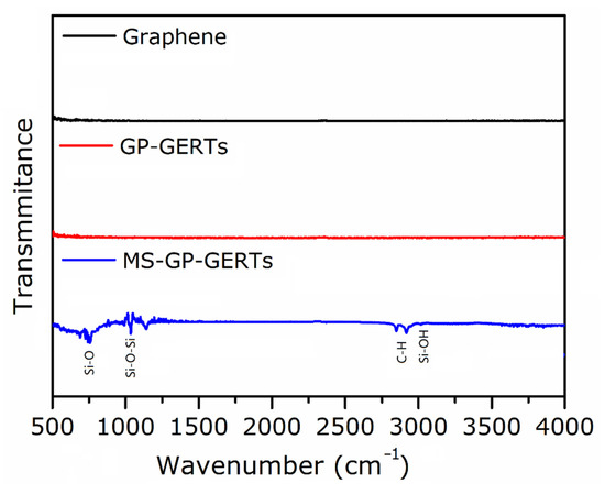 FTIR spectra of graphene, GP-GERTs, and MS-GP-GERTs.
