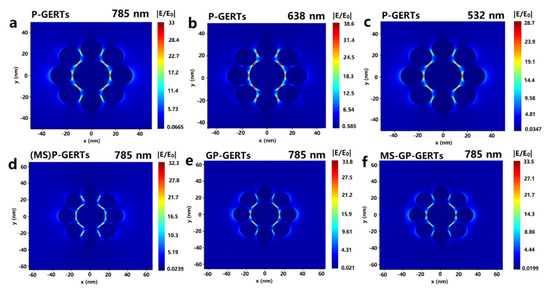 (a–c) Electric field enhancement distributions of single P-GERTs calculated by FDTD at excitation wavelengths of 785, 638, and 532 nm; (d–f) Electric field enhancement distributions of single (MS)P-GERTs, GP-GERTs, and MS-GP-GERTs, all with excitation wavelengths of 785 nm.