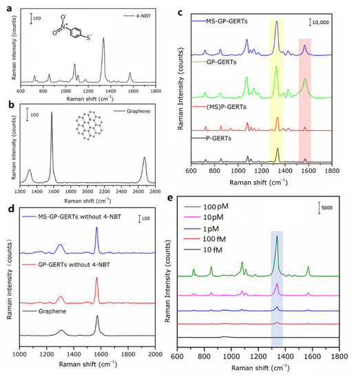 (a) Raman spectrum of 4-NBT on silicon substrate; (b) Raman spectrum of graphene on silicon substrate; (c) Raman spectra of P-GERTs, (MS)P-GERTs, GP-GERTs, and MS-GP-GERTs; (d) Raman spectra of composite structures MS-GP-GERT, GP-GERT, and graphene without 4-NBT molecules; (e) Raman spectra of different MS-GP-GERTs Raman tag concentrations.