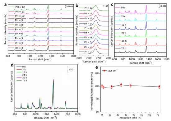 The stability of the Raman signal is an important indicator for evaluating Raman tags. A stable Raman signal for a long time is an important basis for the practical application value of Raman tags. For Raman tags applied in the field of bioimaging, it is usually necessary to maintain stability under various storage conditions and physiological environments (such as different pH and serum solutions). Figure 10a shows the experimental data of the stability study of MS-GP-GERTs in aqueous solutions with different pH values. As shown in Figure 10a, the Raman spectra and signal intensities of MS-GP-GERTs were hardly affected despite the wide range of pH changes (from pH = 3 to pH = 12). This indicates that MS-GP-GERTs have strong pH stability, especially in acidic environments, and the Raman tags reported previously are difficult to maintain in acidic solutions (pH < 5) [14,30] since the Raman 2D peak of graphene is more easily affected by the pH of the solution [49,50]. To evaluate the stability of graphene quality, similar to Figure 8d, we investigated the changes of the 2D peaks of graphene in the composite structure MS-GP-GERTs without 4-NBT molecules in aqueous solutions with different pH values. The experimental results are shown in Figure 10b. It can be seen from Figure 10b that the 2D peaks of graphene were less affected by the pH values of the solution, and the intensity of the 2D peaks hardly changes. Only when the pH value was 3, the 2D characteristic peak was shifted slightly to lower wave numbers. Therefore, we believe that the quality of graphene in the composite structure MS-GP-GERTs is stable in solutions of different pH values.