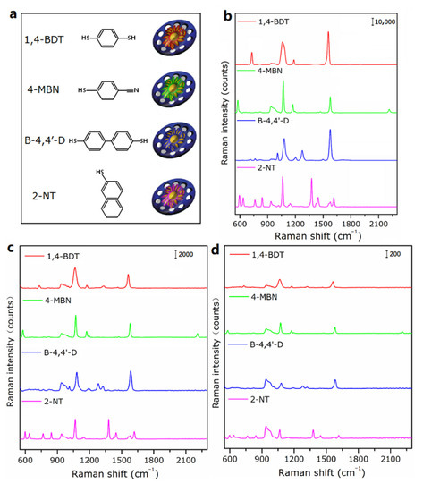 (a) Schematics; (b) Raman spectra of MS-GP-GERTs with different Raman reporters of 1,4-BDT (red), 4-MBN (green), B-4,4′-D (blue), and 2-NT (purple) immobilized in the nanogaps; (c) Raman spectra of MS-GP-GERTs (10 pM) with different Raman reporters; (d) Raman spectra of MS-GP-GERTs (100 fM) with different Raman reporters.