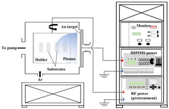 The schematic of the HiPIMS system is shown in Figure 1 and the process parameters for UTGF deposition on collagen substrates is in Table 1. A vacuum chamber with a single rectangular magnet was used for HiPIMS. Collagen substrates were fixed on the holder, and pure gold target (99.99%, 11.4 cm × 33.5 cm, purchased from Solar Applied Materials Technology Co., Tainan, Taiwan) was used for sputtering. The closest distance between the target and the rotating substrates was 6 cm, the substrate rotational speed was set as 20 RPM, and the power supply was provided by TruPlasma Highpulse 4002 (G2TRUMPF Hüttinger Sp. z o. o.). A high peak current density and duty cycle could damage the substrate by overheating. Based on a few preliminary test rounds, the peak current and peak power were maximized, and collagen substrate damage was prevented at the same time. The performance of UTGF on collagen according to deposition time was then studied. The deposition time was based on test rounds on other substrates with the desired UTGF thickness.