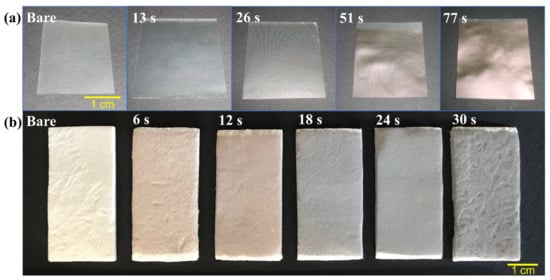 Both collagen substrates are sterilized in gamma irradiation for medical application by manufacturers. However, the mechanism of gamma irradiation is to break down bacterial deoxyribonucleic acid and inhibit bacterial division [26]. For the HiPIMS process, residual fragments of bacteria, impurities, or cross-linking agents used for collagen fabrication are unfavorable for thin film adhesion. Pretreatment of the collagen material surface before gold deposition in the HiPIMS chamber is therefore essential. The species of glow discharge generated by oxygen plasma are more reactive, especially for organic materials such as protein. Surface functional groups and chemical bonds are possibly changed after oxygen plasma treatment. Argon plasma treatment is therefore favored to remove surface contamination of the collagen substrates. After pretreatment with Ar plasma and initial trial of HiPIMS gold deposition on substrate A, the appearance of the specimens was photographed, as shown in Figure 2a. Bare substrate A is semilucent with a pale white color. UTGF-coated specimens of deposition times 13 and 26 s retained their characteristic transparency and revealed a dark gray color, but those of deposition times 51 and 77 s exhibited a light gold color. Bare substrate B is white to yellow with some wrinkles. To create feasible and functional biomedical composites, deposition time was adjusted as 6, 12, 18, 24, and 30 s for substrate B. The color of the specimens was orange to pink after 6 and 12 s, and light gray after 18, 24, and 30 s, as shown in Figure 2b. The colorful appearance revealed nanoscale gold on the surface due to specific surface plasmon resonance phenomenon [27]. AuNPs usually represent red or blue in color depending on the particle sizes due to localized surface plasmon resonance (LSPR) effect. The different electron oscillation modes on the surface of NPs and thin films created different appearances. The “golden” color of 51 and 77 s specimens was similar to bulk gold as the absorption of visible light by the thicker films. Collagen is vulnerable in high-temperature and water-containing environments [28,29,30]. Vacuum in HiPIMS is generally considered harmful for vulnerable materials such as collagen. However, some evidence revealed the safety and insignificant change of protein in low- and even high-vacuum conditions [31,32]. The extremely dehydrated environment achieved in vacuum is supposed to avoid protein degradation. Deformity of substrate A was observed in a drying oven at 40 °C after 40 min (photos not shown here). In contrast, both substrates A and B were grossly intact without shrinkage, melting, or perforation after HiPIMS treatment.