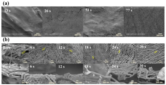 SEM images of UTGF-coated substrates A and B of different deposition times from the top view and oblique cross-sectional view are shown in Figure 3. The SEM images of substrate A with deposition times 26 and 51 s (Figure 3a) revealed the preserved fibril structure of collagen, and the width of the fibrils was about 1–1.5 μm, which was consistent with the literature description [14,33]. A wavy appearance on the surfaces may be attributed to the overlapping of dark and light bands of collagen fibers. The surface morphology of deposition time (51 s) showed a flattening of the wavy surface, which suggested that a longer deposition time contributed to the higher cohesive force of AuNPs, resulting in continuous thin film formation. SEM images of substrate B with deposition times of 6, 12, 24, and 30 s, as shown in Figure 3b, also revealed preserved collagen fibers after UTGF deposition. The interfibrillar space (between the yellow lines) of bare substrate B was around 300 nm but decreased to 200 nm in the specimen of deposition time 30 s. Under the microscopic field, the inhomogeneity of the fibrillar structure inhibited the representativeness of interfibrillar space measurement. Compared with bare substrate B, the specimen of deposition time of 6 s showed AuNP deposition on the fibril surfaces, which were smaller than 10 nm. The specimen of deposition time 30 s showed a wavy appearance as type 1 collagen fibers, which indicated islands and discontinuous film growth of HiPIMS gold deposition between deposition times of 6 and 30 s. The growth pattern fitted well with the Volmer–Weber model rather than layer-by-layer growth theory in the early phase of thin film growth [34,35].