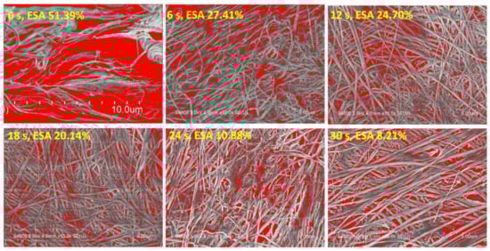 SEM images of UTGF-coated substrates B: red area indicated substrate exposure area process by the ImageJ software. The 0 s represented substrate post Ar pretreatment and HiPIMS vacuum without further deposition. The 6 s, 12 s, 18 s, 24 s and 30 s represented UTGF deposition time. ESA indicated substrate exposure area in percentage.