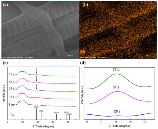(a) SEM images of UTGF-coated substrate B at 6 s (magnification 200,000 times) and (b) EDS mapping of Au. (c) XRD spectrum of substrate A of different UTGF deposition time. Black arrows indicated peaks of Au (111). (d) High-resolution spectrum of 2θ: 36–40.5° on specimens of 26 s, 51 s and 77 s.