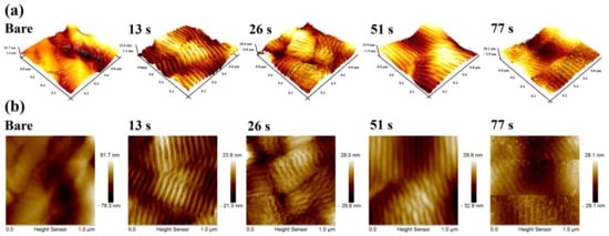 (a) AFM surface topography on substrate A: bare and UTGF films at deposition time of 13 s, 26 s, 51 s, and 77 s. (b) AFM color variation scale on substrate A: bare and UTGF films at deposition time of 13 s, 26 s, 51 s, and 77 s.
