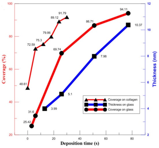 The thickness of UTGF was 3–10 nm, and Au (111) peaks were noted by XRD only on films thicker than 7.98 nm, as shown in Figure 5b. The roughness of bare substrate was not well demonstrated consistently due to fragility. The Ra values of 13 and 26 s specimens were low and similar. Increased Ra was observed on specimens of 51 and 77 s with a linear trend. Similar to Ra, Rmax of the 13 and 26 s specimens were not significantly different. Rmax of 51 and 77 s were much larger than that of the 13 and 26 s specimens. However, no linear trend was observed by increasing the deposition time. According to gold thin film adhesion and growth theory [34,49], the observation suggested a granular to island structure growth of 13–26 s deposition time and percolation of 51–77 s. The difference in height for the UTGF-deposited and bare glass substrate represented film thickness. UTGF surface coverage percentage was calculated using the same method as in Figure 4. The relationship between deposition time and thickness or surface coverage of UTGF-coated collagen and glass substrates is plotted in Figure 7. The comparison of UTGF appearance and thickness on substrate A is listed in Table 4. The film thickness increases as the deposition time increases. UTGF of 10.37 nm on the glass substrate presented a discontinuous thin film with fluctuating microstructures, and part of the collagen substrates exposed with preserved characteristics and functions are clinically beneficial to skin wound recovery [1,31]. Under the same settings of HiPIMS deposition, the surface coverage of UTGF was lower on the glass substrate than on collagen. The coverage percentage difference between the glass and collagen substrate was as high as 22.05% at a deposition time of 30 s, which indicates that HiPIMS would be beneficial to bonding between AuNPs and collagen surface molecules [48].