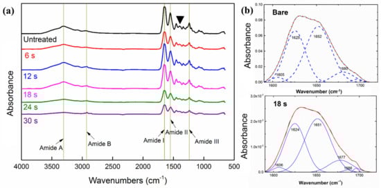 (a) ATR-FTIR spectrum of substrates B: bare and UTGF films at deposition time of 6 s, 12 s, 18 s, 24 s, and 30 s. Arrows and straight lines indicated amide groups. Arrowhead indicated peaks of pyrrolidine rings. (b) ATR-FTIR spectrum of substrates B: bare and UTGF deposition time 18 s. The blue lines were deconvolution curves and the numbers of different wavenumbers corresponded with the different secondary structures of protein. The red lines were fitted curves and the black lines were original data.