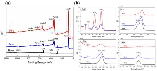 (a) Comparison of XPS broad spectrum of bare substrate B and specimens of UTGF deposition time of 24 s and 96 s. (b) The high-resolution spectrum of Au 4f, C 1 s, O 1 s, and N 1 s on bare and UTGF-coated substrate B.