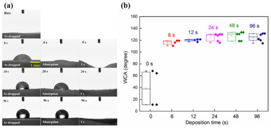 (a) Photos of WCA measurement on bare and UTGF-coated substrates B. 0 s represented substrate underwent vacuum treatment in HiPIMS chamber without sputtering. 24 s and 96 s represented HiPIMS gold deposition time. Bare substrate absorbed water immediately as dropped. Specimen of 0 s showed hydrophilicity and specimen with UTGF revealed hydrophobicity as dropped and during water absorption. Deformity of 0 s specimen was observed and all specimen absorbed water within 1 s. (b) Box chart of WCA on bare and UTGF-coated substrate B. The diamond dots represented a different measure of each sampling.