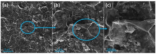SEM images of the multi-layered porous structure of the CeO2-Pd-PDA/rGO heterojunction nanocomposite with wrinkles and open edges at different magnifications. Scale bar: (a) 5 µm, (b) 1 µm, and (c) 500 nm.