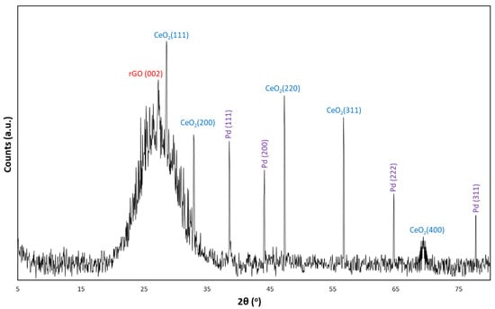 The XRD analysis of the CeO2-Pd-PDA/rGO heterojunction nanocomposite is shown in Figure 4 to signify its degree of crystallinity. The XRD profile confirmed a relatively broad peak at 2θ = 27.3° corresponding to the (002) graphitic plane of the partially restacked rGO NSs with the intralayer spacing of 0.326 nm between the rGO NSs, calculated from Bragg’s law (2), as shown below: