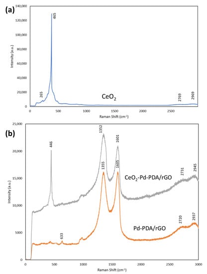 The Raman spectra of the ceria, (a) CeO2, and (b) Pd-PDA/rGO, and CeO2-Pd-PDA/rGO nanocomposite.