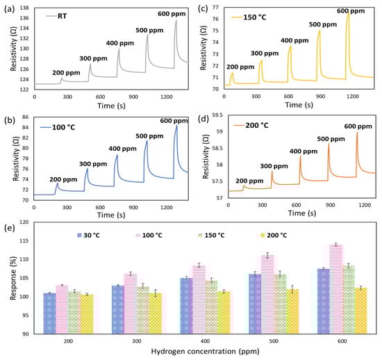 The gas sensing properties of semiconductor sensors are greatly dependent on the operating temperature due to the direct relation with their chemo-resistive adsorption-desorption behaviour and, more importantly, the association with power consumption and cost of experiment []. Therefore, to optimise the operating temperature as a key element in gas sensing valuation, the dynamic response of the fabricated CeO2-Pd-PDA/rGO sensor towards H2 with different concentrations (200–600 ppm) was examined at different working temperatures (30 °C up to 200 °C) and 0% relative humidity (% RH) in the dark environment (Figure 7). As shown in Figure 7, the CeO2-Pd-PDA/rGO sensor behaves as a p-type semiconductor, where its resistivity increases upon exposure to H2 (reducing gas) due to the charge transfer from the target gas molecules to the sensing layer []. The electrons move from H2, as an electron donor gas, to the valence band of the CeO2-Pd-PDA/rGO nanocomposite, which reduces the hole concentration on the surface and, as a result, its conductivity.
