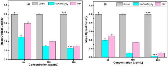 2.5. Antimicrobial Potential of HAP and HAP/MnFe2O4 Nanocomposite
