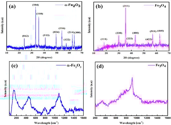 XRD diffractograms of (a) hematite (α-Fe2O3) and (b) magnetite (Fe3O4) nanopowders; Raman spectra of (c) hematite (α-Fe2O3) and (d) magnetite (Fe3O4) nanoparticles.