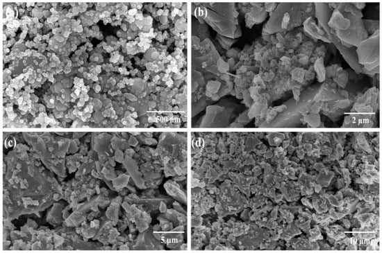 Scanning electron microscopy (SEM) analysis was performed to examine the morphology and particle sizes of hematite and magnetite powders before and after ball milling. Figure S2a–d and Figure S3a–d depict the SEM micrographs of hematite and magnetite micro-size powders before ball milling up to different resolution ranges, respectively. The laser particle size analyzer was deployed initially to examine the sizes of hematite and magnetite powders and the results are displayed as histograms in Figure S4a,b. Similarly, Figure 2a–d, and Figure 3a–d manifest the SEM micrographs of hematite and magnetite powders after ball mill. Furthermore, energy-dispersive spectroscopy (EDS) analysis was conducted to confirm the atomic and weight percentages of iron and oxygen in hematite and magnetite ball-mill-treated samples, and the results are displayed in Figure S5a–d.