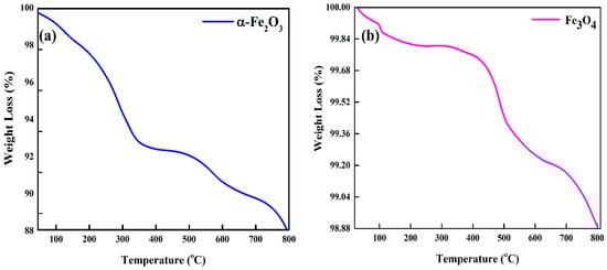 TGA curve of (a) hematite (α-Fe2O3) and (b) magnetite (Fe3O4) nanoparticles.