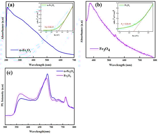 UV–Vis absorption spectra of (a) hematite (α-Fe2O3) and (b) magnetite (Fe3O4) nanoparticles; PL spectra (c) of hematite (α-Fe2O3) and magnetite (Fe3O4) nanoparticles.