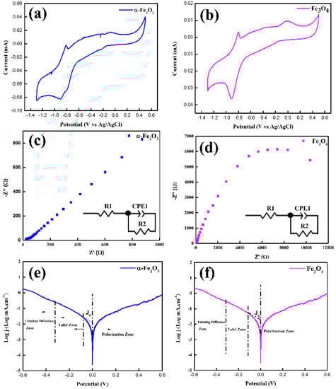 Cyclic voltammetry curves of (a) hematite (α-Fe2O3) and (b) magnetite (Fe3O4) nanoparticles, EIS spectra of (c) hematite (α-Fe2O3) and (d) magnetite (Fe3O4) nanoparticles; tafel polarization curve of (e) hematite (α-Fe2O3) and (f) magnetite (Fe3O4) nanoparticles.