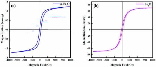 M-H curves for (a) hematite (α-Fe2O3) and (b) magnetite (Fe3O4) nanoparticles.