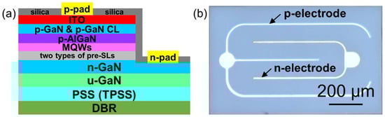 A layer of indium tin oxide film was deposited on p-GaN CL with a thickness of 50 nm as the current spreading layer, and then annealed at 550 °C for 30 min in N2 atmosphere. The mesa was achieved by standard photolithography and the inductively coupled plasma etching process. Cr/Al/Ti/Au (50/1700/40/200 nm) layers were deposited through electron beam evaporation to act as p- and n- contact electrodes, and then annealed at 250 °C for 15 min. The devices were passivated by a layer of SiO2 (225 nm) through plasma-enhanced chemical vapor deposition. Afterwards, 40 pairs of Ti2O5/SiO2 (46.4/76.8 nm) distributed Bragg reflectors (DBRs) were coated on the backside of the wafer after grinding and polishing processes. The BLED chips were separated by wafer laser dicing. The devices were mounted on the alumina substrates and wire-bonded followed by covering yellow phosphors. Figure 1a illustrates a cross-sectional schematic diagram of an LED chip. An optical photo of a chip (22 × 40 mil2) is presented in Figure 1b. The optical and electronic performance of these two types of BLEDs were tested by the integrating sphere (Everfine).