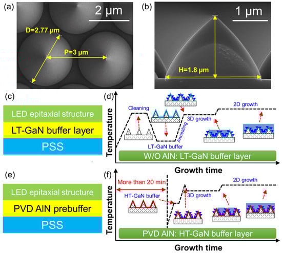 In this part, PVD AlN prebuffer layer, in contrast to W/O AlN for BLED epitaxial structure, was demonstrated in terms of the growth time, material quality, and φe in the mass production. Because of the large lattice mismatch (~16%) and thermal mismatch between GaN film and (0001) sapphire substrate [], improving the material quality is crucial for fabrication of high efficiency nitride-based devices. Disruptive breakthroughs of high-quality GaN films originated from the development of LT GaN or AlN buffer layers [,]. The LED epitaxial structure was grown on 4-inch PSS, yielding periodically arrayed cone-shaped sapphire substrates. The height and base diameter of the cone were 1.8 µm and 2.77 µm (H = 1.8 µm, D = 2.77 µm), respectively, and the period was 3 µm (p = 3 µm) (see Figure 2a,b). The cone-shaped array exhibited a smooth sidewall and good periodicity. This is beneficial to the uniform gas flow field distribution of the reaction chamber, and then ensures the uniformity of electrical and luminescence properties of LED devices. Epitaxy processes of LED samples using W/O AlN and PVD AlN prebuffer during the MOCVD process were compared. For W/O AlN, Figure 2c,d show schematic diagrams of the epitaxial structure and curves of temperature transients during the MOCVD process. In detail, PSS first underwent a heating and high-temperature (HT) cleaning process at 1050 °C. Then, the LT-GaN layer was grown at 540 °C for 4 min through a cooling procedure maintained for approximately 13 min. Subsequently, after a 9 min heating ramp, three-dimensional (3D) island growth and two-dimensional (2D) lateral growth were implemented in order.