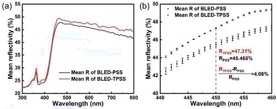 (a) Reflection spectra of BLED-PSS and BLED-TPSS wafers with incident wavelengths from 300 nm to 800 nm; (b) Zoomed reflection spectra at incident wavelengths around 450 nm.