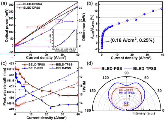 The peak wavelength (λp) and FWHM of the electroluminescence (EL) spectra are presented in Figure 6c. The λp of both BLED-PSS and BLED-TPSS is located at approximately 450 nm, corresponding to the radiation recombination of electron–hole pairs of blue emission. λp blueshifts from 452.2 to 449.4 nm for BLED-PSS, and 452.6 to 450.2 nm for BLED-TPSS as Jin increases from 0.07 to 39.5 A/cm2. In this case, a quantum-confined Stark effect (QCSE) is generated within the MQW region at no Jin caused by spontaneous and built-in piezoelectric fields, especially for the LED structure [], which will reduce the overlap integral of electron/hole wave-functions. As a result, the charge screening and band filling effects would gradually weaken the QCSE as Jin increases, subsequently leading to a blueshift in the λp. The FWHM of both LEDs behaves faintly larger when Jin changes from 0.07 to 40 A/cm2. This is ascribed to the native fluctuation of In composition in MQWs, and more electron–hole pairs would be excited as Jin increases []. Far-field radiation patterns of BLED-PSS and BLED-TPSS in the range of 0–90° are experimentally measured (see Figure 6d). Compared to BLED-PSS, BLED-TPSS exhibits a higher relative intensity, which is consistent with the simulation results. However, the deviation is that the HVs of BLED-PSS and BLED-TPSS are larger than the simulated results, in which the experimental results are affected by many processes, such as dicing, gold wires, and package substrate. Additionally, BLED-TPSS has a more convergent emission pattern with an HV 11° lower than that of BLED-PSS.