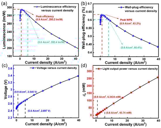 We fabricated WBEDs by incorporating BLEDs and yellow phosphor through a PC-LED package strategy. The Jin dependence of ηL, wall-plug efficiency (WPE), operated voltage, and φe are shown in Figure 7. The peak ηL and peak WPE reach maxima of 295.2 lm/W and 63.2%, respectively, at a Jin of 0.9 A/cm2. It is worth noting that the ηL and WPE retained 282.4 lm/W and 60.4% at a Jin of 5.6 A/cm2, respectively. The ηL and WPE decrease as Jin (greater than 0.9 A/cm2) increases, which is the common droop effect for LED devices. It may originate from Auger recombination, carrier leakage, carrier localization, and other factors [,].