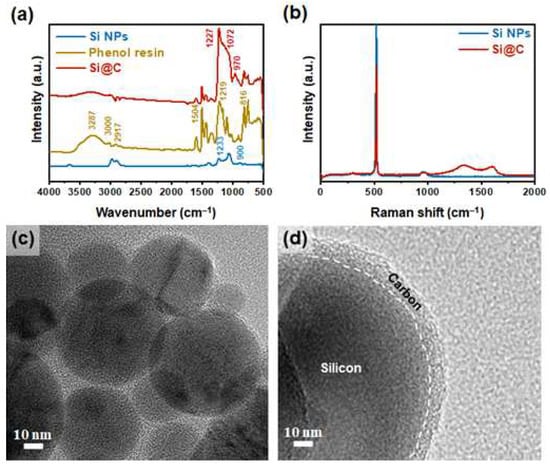(a) FT−IR spectra of Si NPs, phenolic resin, and Si@C; (b) Raman spectra of Si and Si@C NPs; (c,d) TEM images of Si@C.