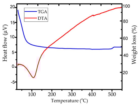 The study on the synthesis and identification of Zn-Al LDHs material is mainly on the effect of calcination on the structure and some properties such as crystallinity, the specific surface area, and the optical properties of the material. A calcination temperature of 400 °C was selected based on previous work that identified the effect of temperature on the adsorption performance of Zn-Al LDHs [12]. In addition, the confirmation was obtained based on the DTA-TGA thermogram as presented in Figure 1.