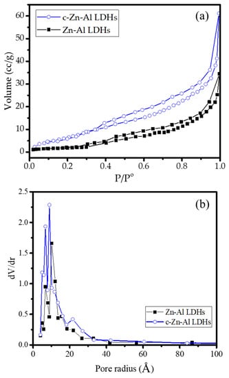 Both samples show the sharp diffraction peaks associated with (003), (006), (009), (015), (018), (010), (1010), (0111), (110), and (113) diffraction planes of the LDHs structure, which was following the database of JCPDS number 38-0486 [7,14]. It was observed that a similar pattern appeared for c-Zn-Al LDHs, which confirmed the formation of the hydrotalcite lamellar structure. From the d003 values of both samples, a smaller angle of the reflection in c-Zn-Al LDHs is associated with the higher interlayer space caused by the calcination process. The d003 of Zn-Al LDHs and c-Zn-Al LDHs are associated with the values of 7.93 and 8.09 nm, respectively, indicating the opening space that aimed to obtain better adsorption and photocatalytic capability. This phenomenon was similar with what was reported by calcining Zn-Al LDHs, calcined Mg-Al LDHs, and Zn-Al LDHs intercalated with Ag [15,16,17]. By using the (003), (006), and (009) peaks, the crystallite size of LDHs were calculated based on the Scherer equation (Equation (2)):